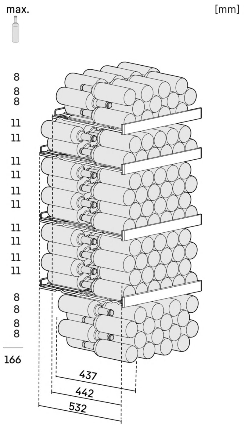 - Le saviez-vous ? : La capacité annoncée est la capacité maximale mesurée selon le standard européen EN62552. Ce standard est calculé avec des bouteilles 75cl type bordeaux tradition. La capacité annoncée correspond donc au nombre de bouteilles de bordeaux possibles avec le nombre de clayettes fournies dans la cave.