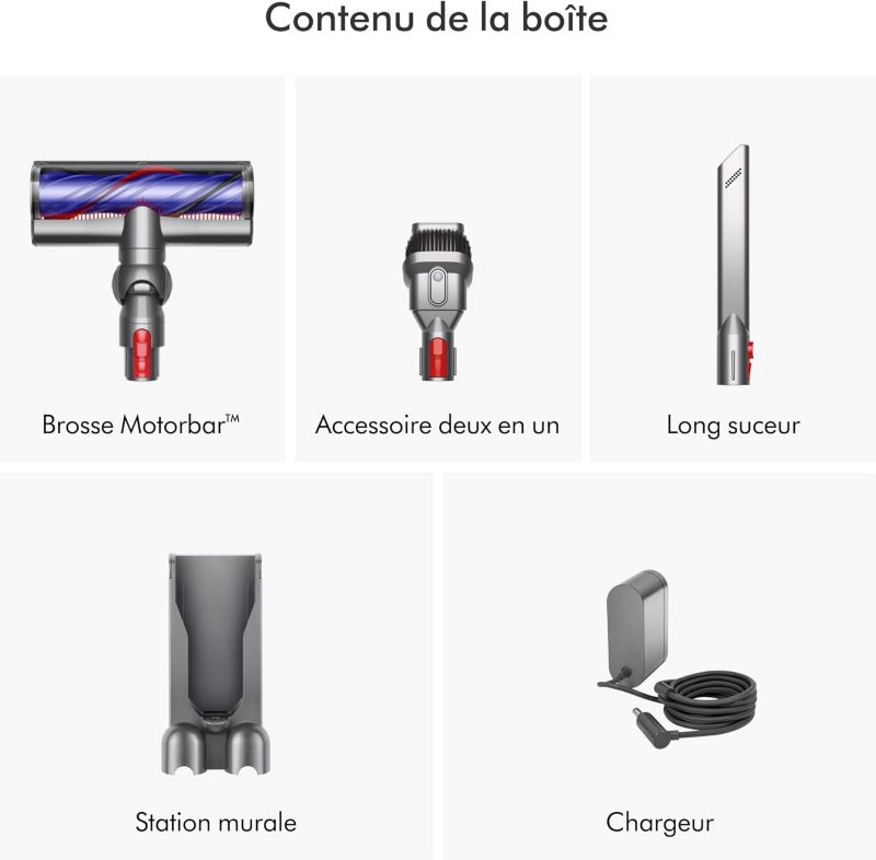 - Livré avec : Suceur long, Brosse Motorbar, Accessoire combiné, Station murale de charge et de rangement