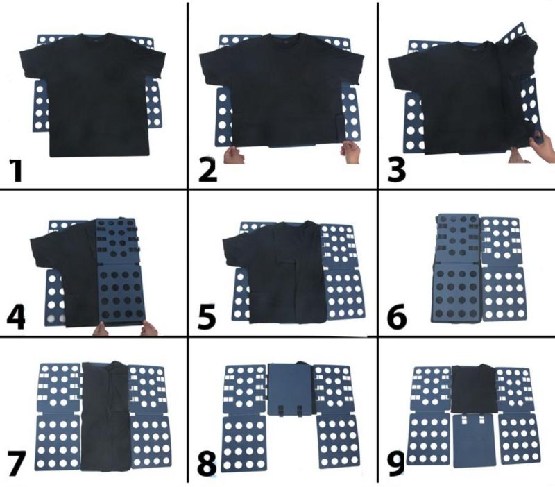 - Fonctionnement : Compatible tous vêtements (Adulte et Enfant), pliez simplement votre linge en 3 étapes. 1/ rabattre le côté droit. 2/ rabattre le côté gauche. 3/ rabattre la partie basse.