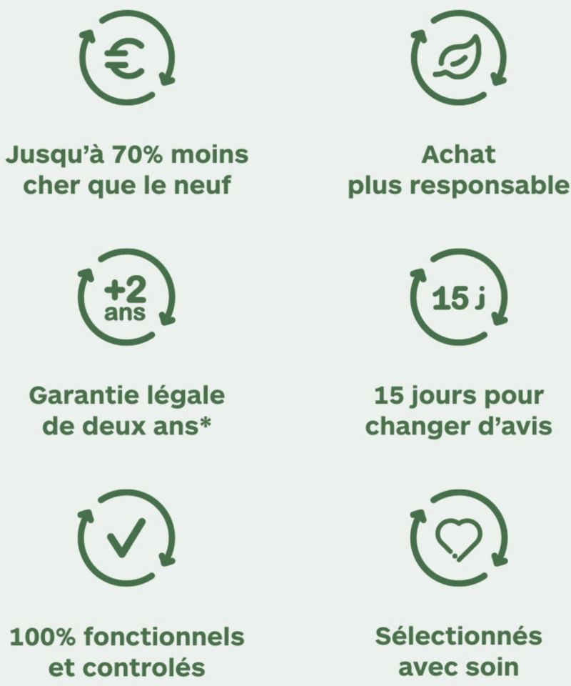 - Etat de la batterie du smartphone reconditionné : Minimum 85% de la capacité maximale de charge