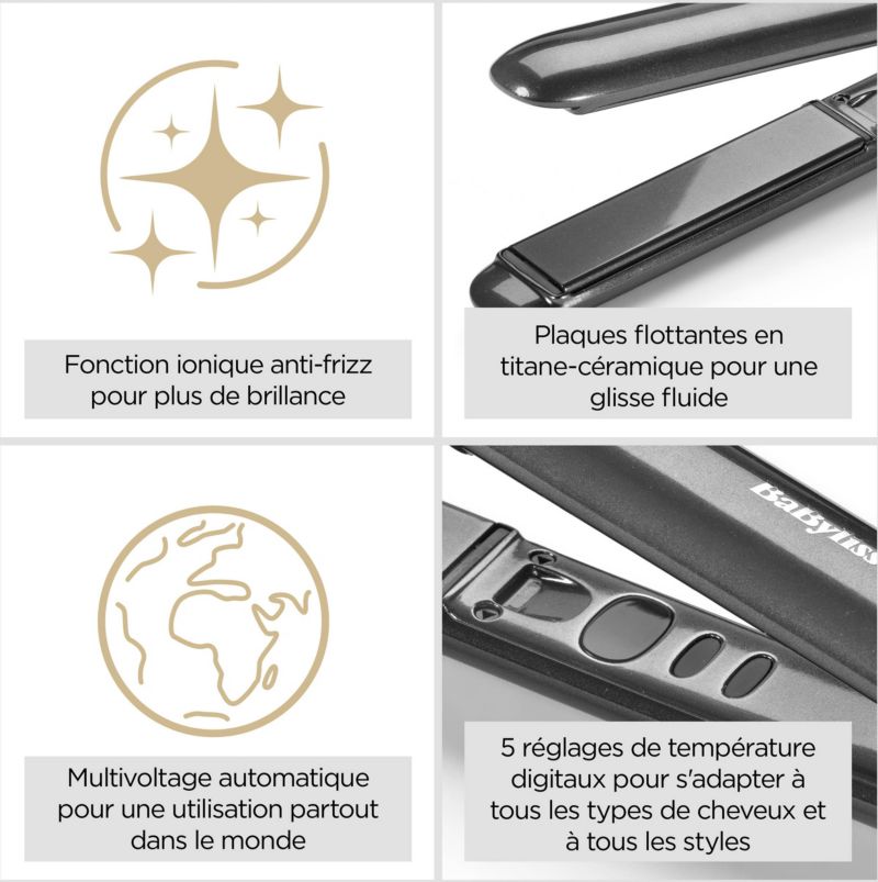 Le + : Lisseur digital & performant, fonction ionique Anti-Frizz pour des cheveux ultra-brillants