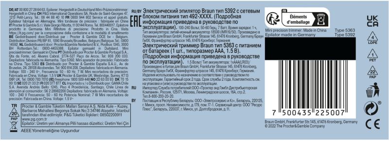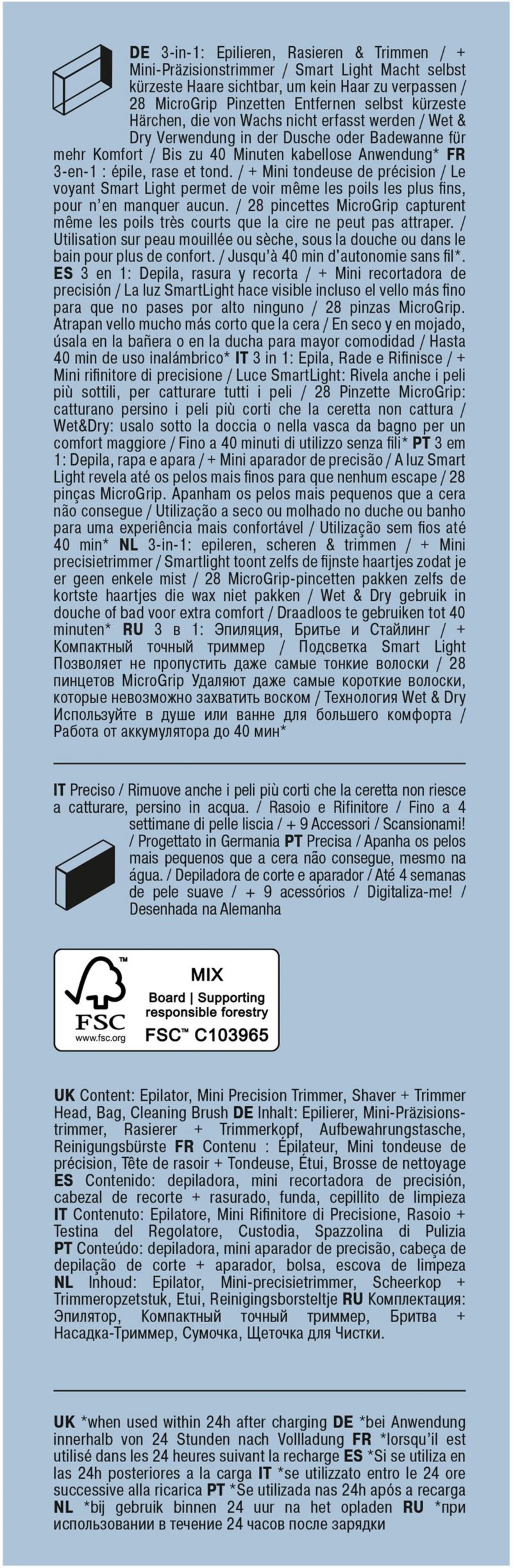 - Livré avec : Câble d'alimentation, Tête d'épilation, Housse de rangement, Brossette de nettoyage, Mini tondeuse de précision, Tête de rasoir + Tondeuse