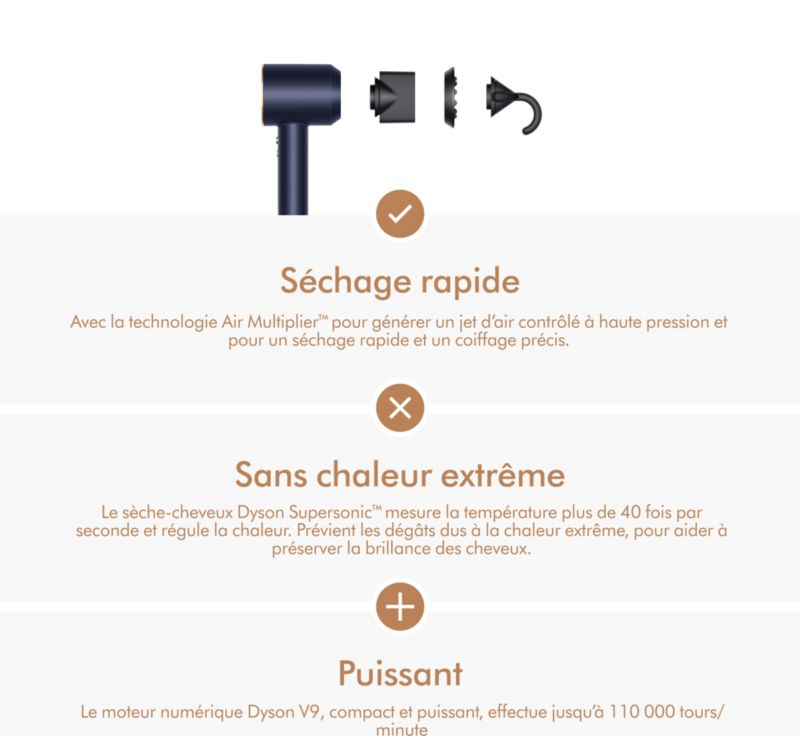 Le + : séchage rapide et sans chaleur extrême avec plusieurs accessoires pour divers styles.