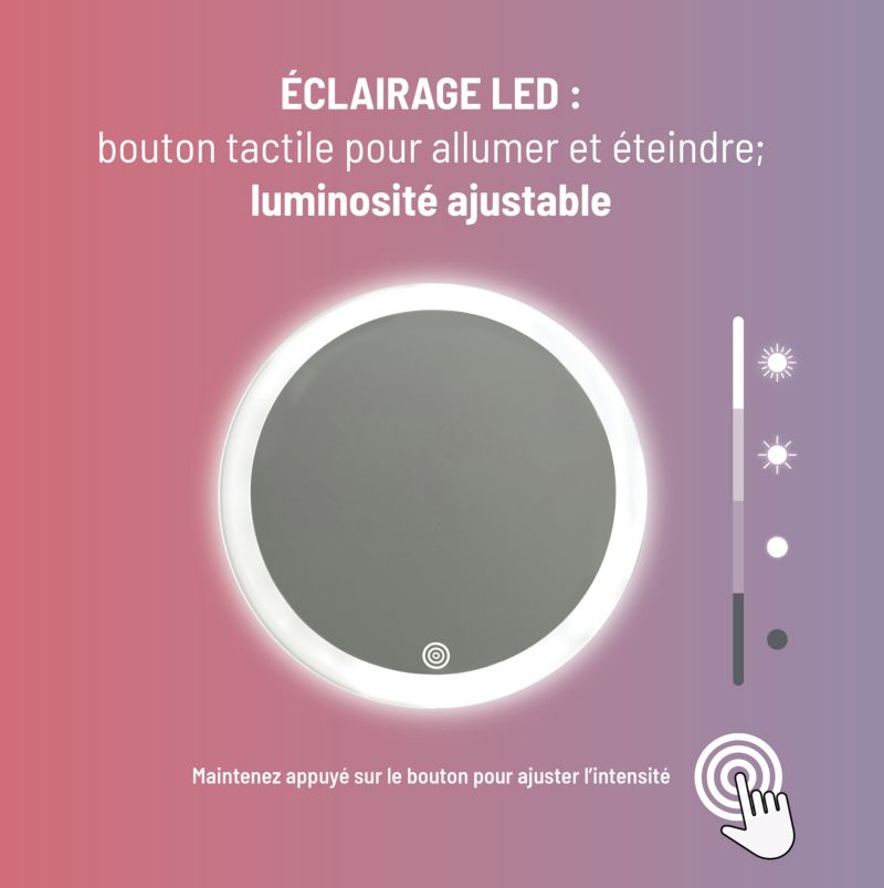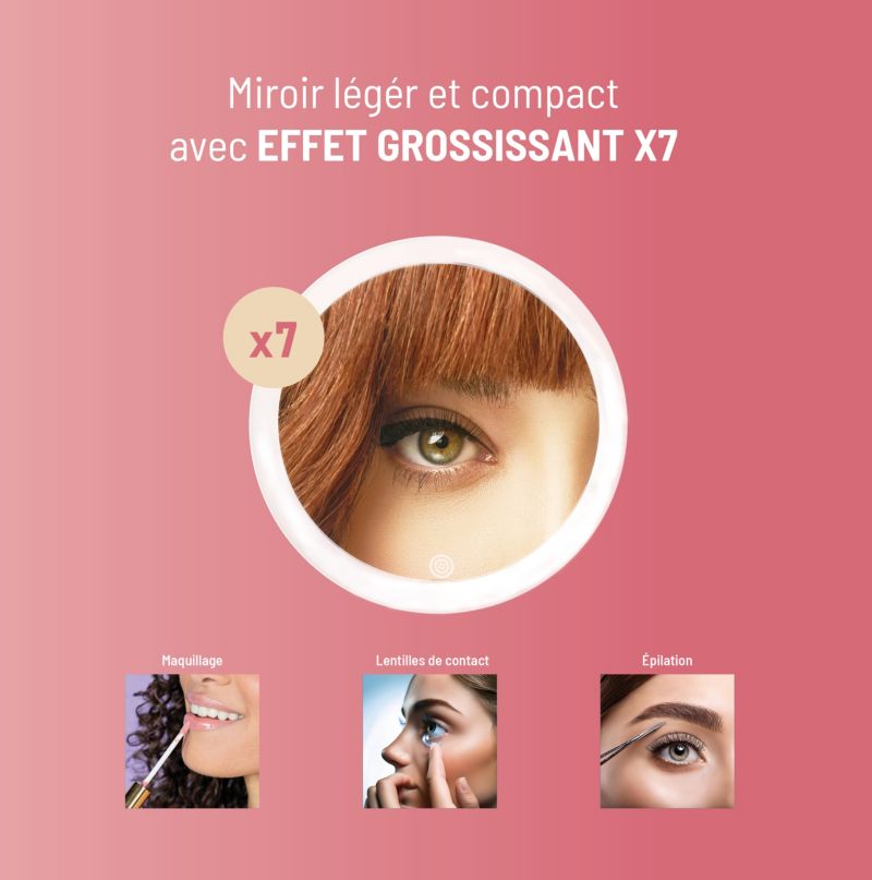 - Spécificités : Miroir grossissant x7, léger et compact. Éclairage LED tactile à intensité réglable. Parfait pour maquillage, épilation, lentilles. Fixation facile avec ventouse et aimant. Amovible et orientable. Batterie rechargeable (USB-C), 2h d'autonomie. Diamètre : 14,5 à 17 cm.