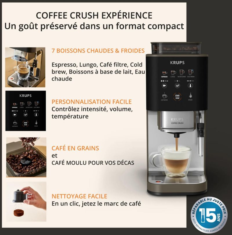 Expresso Broyeur KRUPS Coffee Crush Experience, Machine à café à grains ultra compacte SA403BE0 (réf : 1235195)