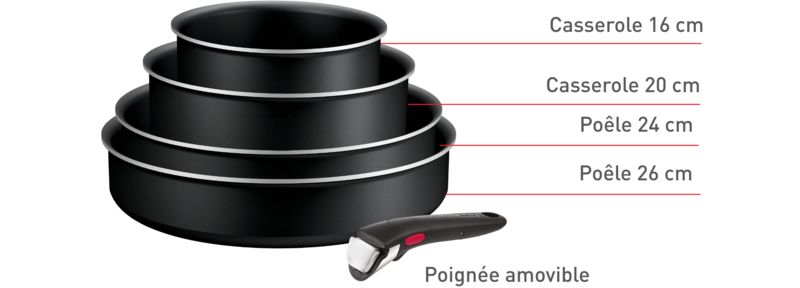 - Contenu du set : deux poêles (24/26 cm), deux casseroles (16/20 cm) et une poignée amovible