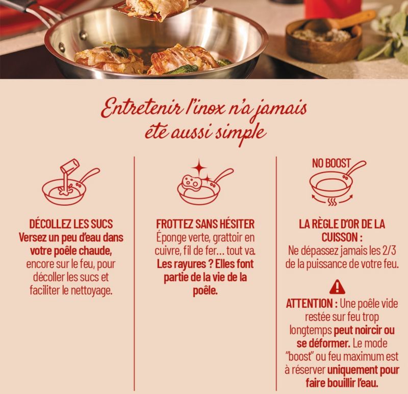 - Température modérée : Évitez les températures trop élevées, surtout sur les plaques à induction. Une chaleur excessive peut nuire aux performances naturelles de l'inox en matière d'antiadhérence.
