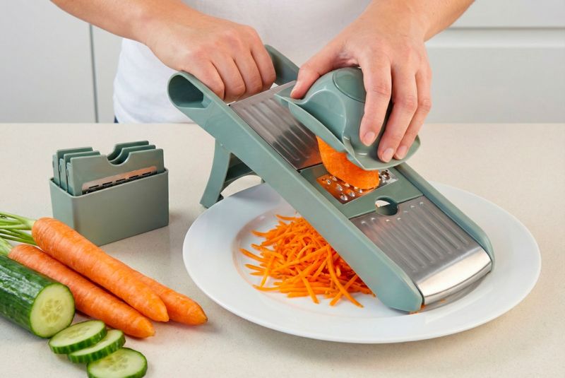 - Composition du set : Mandoline + 4 râpes en inox avec étui de rangement + un poussoir