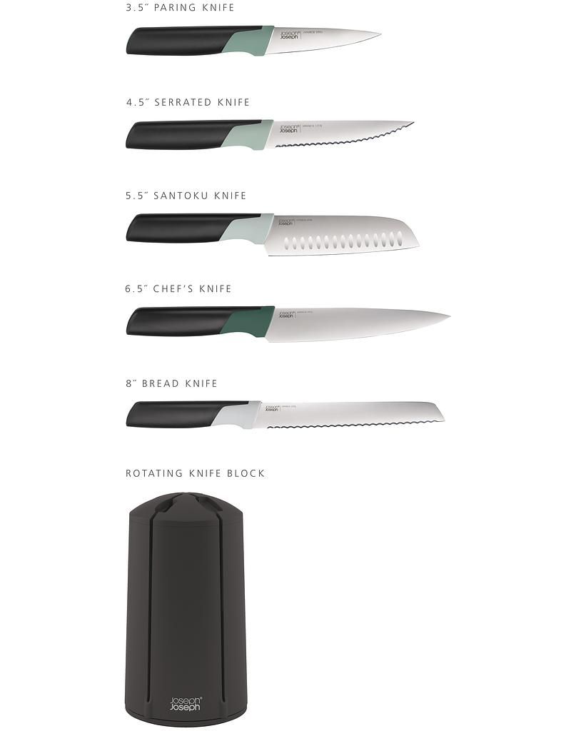 - Particularité : Le pack comprend : Couteau de cuisine 9cm, couteau dentelé 10cm, couteau santoku 13cm", couteau de chef 15cm, couteau à pain 20cm et support à couteaux rotatif