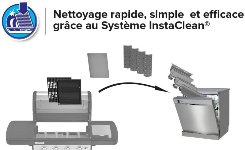 Le + : Polyvalence des grilles adaptables, les 4 bruleurs et le chariot avec tablettes