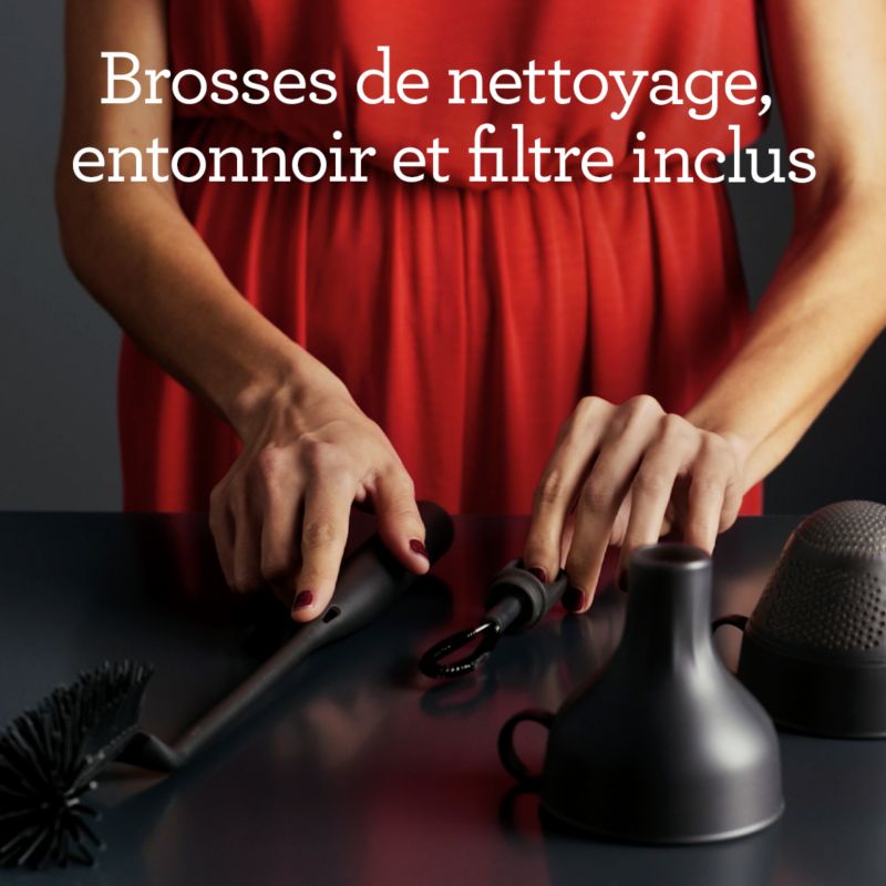 - Accessoire(s) supplémentaires(s) : bouteille de 1 L avec couvercle et base en acier inoxydable, brosse de nettoyage, entonnoir et tamis