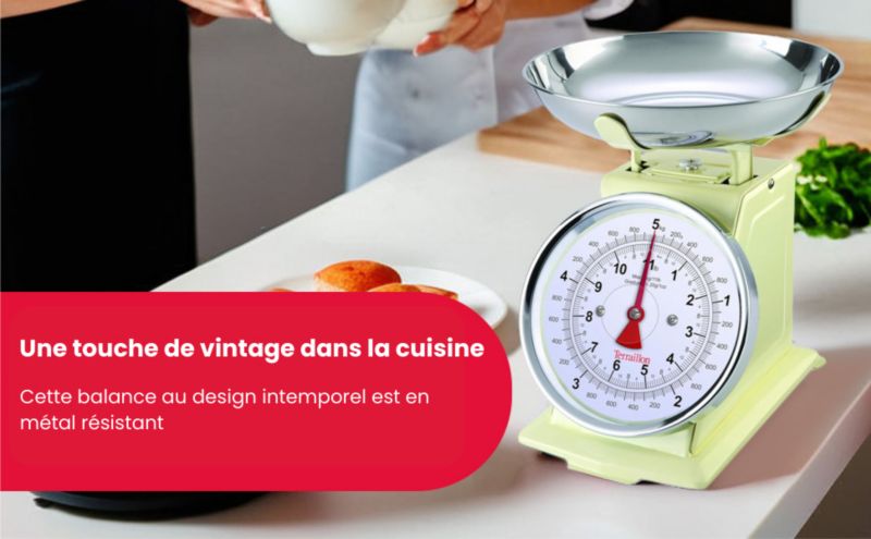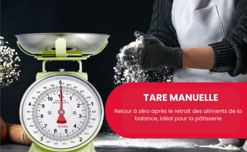 Le + : Graduation par 10 g., conversion des liquides, plateau inox amovible et grand cadran