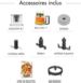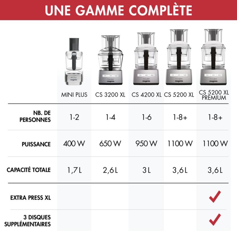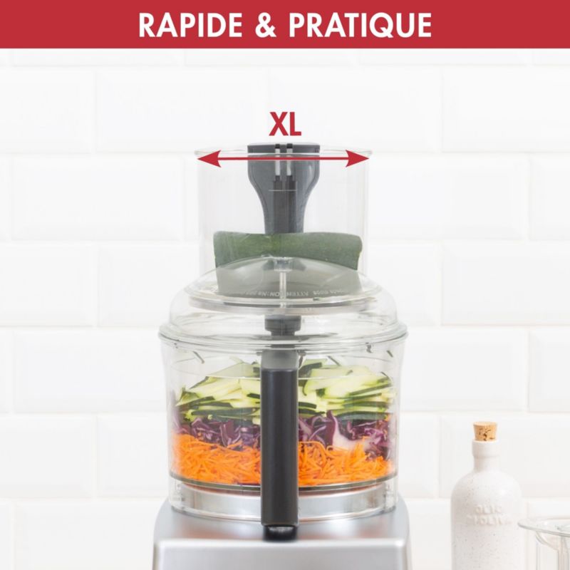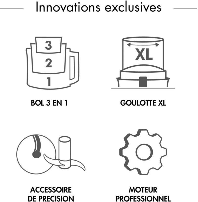 - Accessoires : 3 cuves (cuve standard, mini-cuve, midi cuve), batteur, boîte de rangement des accessoires, disque(s) éminceur, disque(s) râpeur, spatule