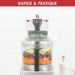 - Livré avec : Notice, Livre de recettes, 3 cuves (cuve standard, mini-cuve, midi cuve), batteur, boîte de rangement des accessoires, disque(s) éminceur, disque(s) râpeur, spatule