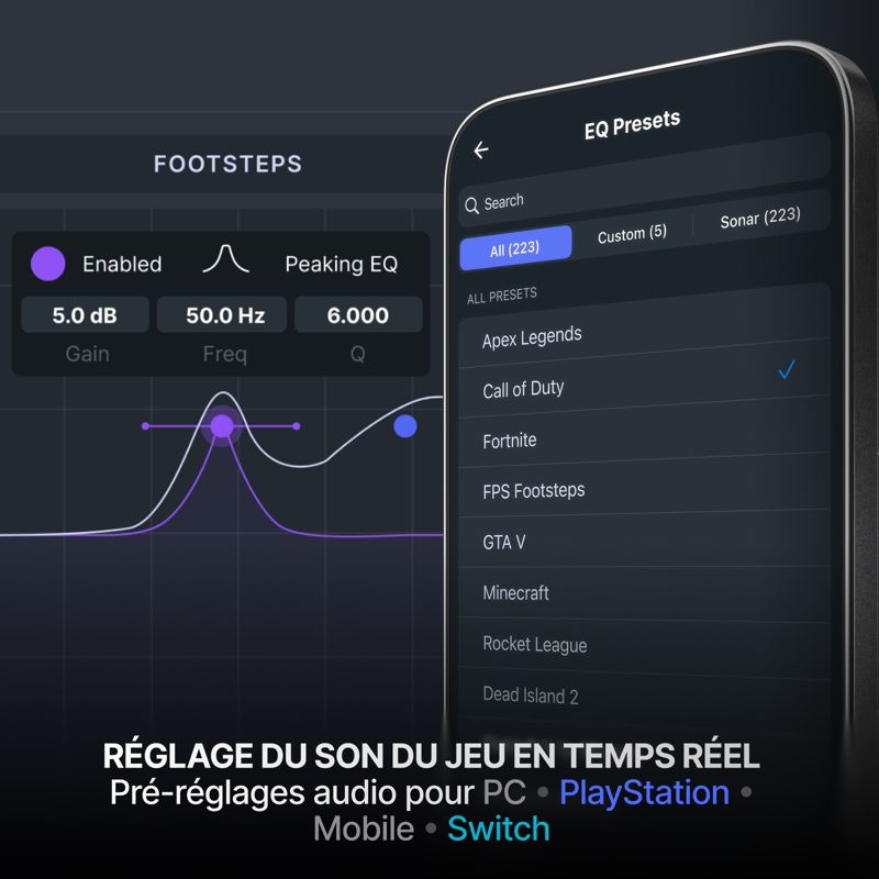 - Le saviez-vous ? : représente la plage de fréquence couverte par le casque, du grave à l'aigu. La plage de fréquence de fonctionnement de l'oreille humaine est de 20 Hz (son le plus grave) à 20 kHz (son le plus aigu)