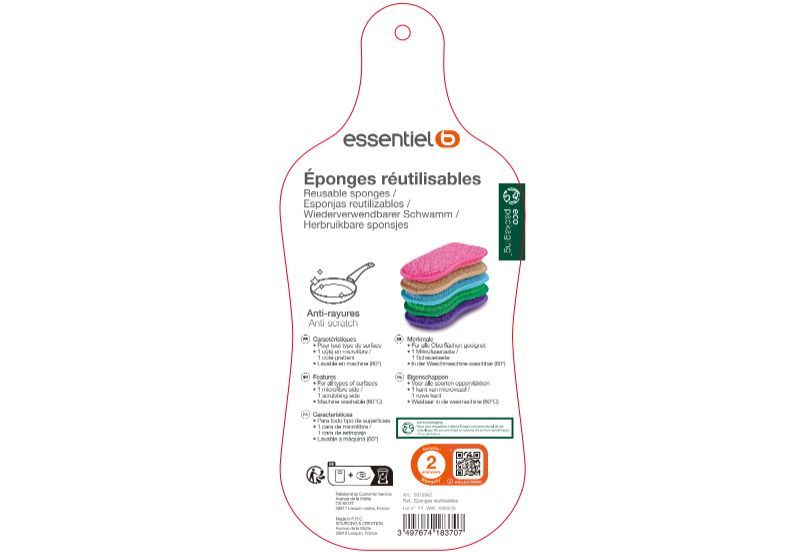 - A quoi ça sert ? : Éponge lavable multi-coloris disposant d'une face grattante anti-rayure pour désincruster et d'une autre plus douce en microfibre pour dégraisser. Respectueux de l'environnement, les éponges sont lavables à 60° en machine pour éviter le développement de microbes.