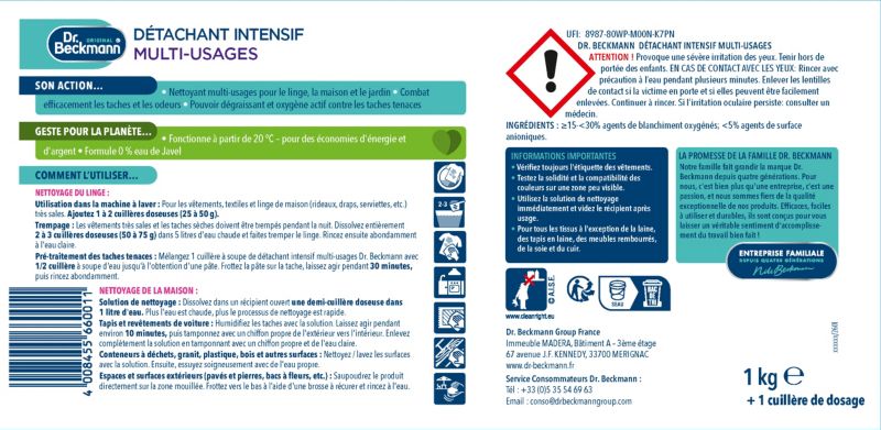 - A quoi ça sert ? : DÉTACHANT INTENSIF : Ce détachant multi usages Dr. Beckmann est une poudre détachante pour les vêtements et les surfaces, conçu pour éliminer les taches et les odeurs. Sa formule à base d'oxygène actif agit efficacement contre les taches tenaces. Sans chlore. Cuillère incluse