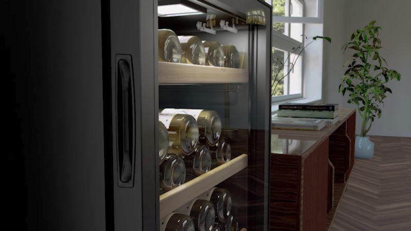 - Type de porte : vitrée, permet de visualiser facilement les bouteilles sans avoir à ouvrir la porte, ce qui réduit la circulation de l'air dans la cave et donc la variation de la température. Le système de protection contre les UV protège le contenu.