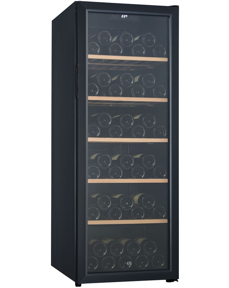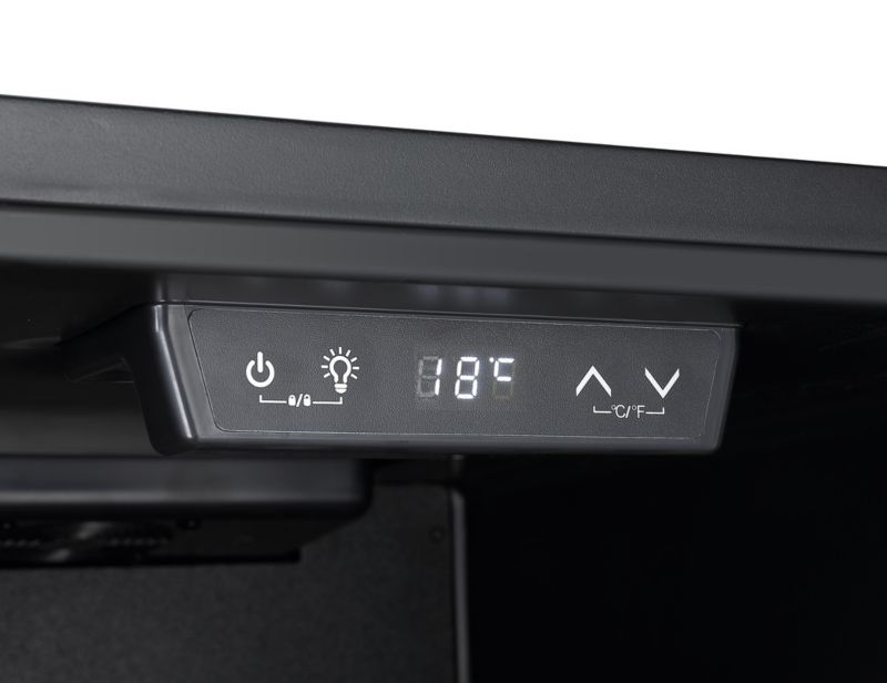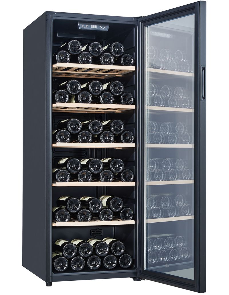- Type de porte : vitrée, permet de visualiser facilement les bouteilles sans avoir à ouvrir la porte, ce qui réduit la circulation de l'air dans la cave et donc la variation de la température. Le système de protection contre les UV protège le contenu.