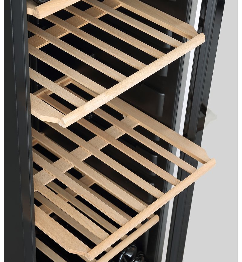 - Type de clayettes : clayette classique, permet d'optimiser le rangement à l'intérieur de la cave à vin et de présenter des bouteilles en position verticale, semi-inclinée.