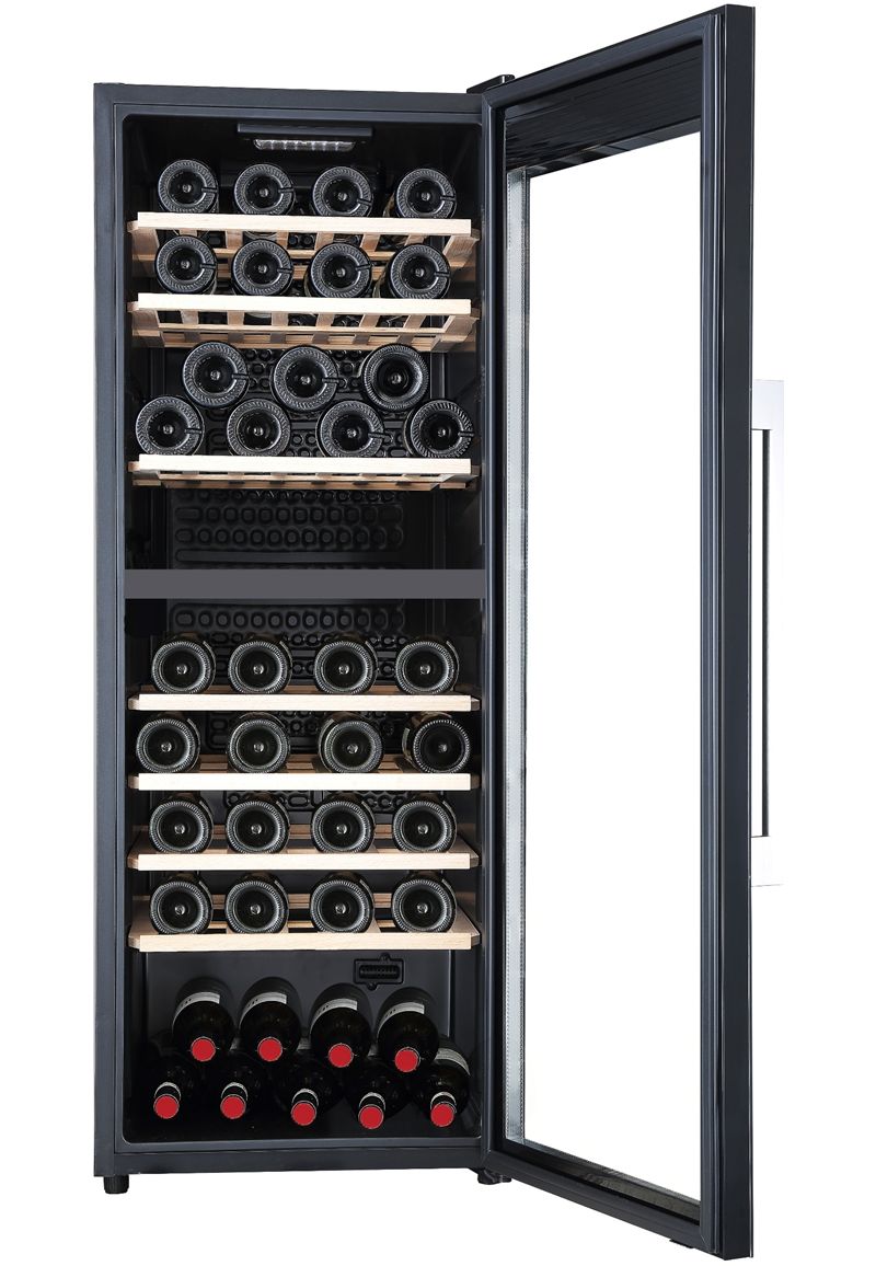 - Type d'appareil : cave à vin polyvalente, elle combine plusieurs plages de températures en fonction des zones, soit pour vieillir le vin soit pour le mettre à la température de service. Idéale pour les oenophiles et collectionneurs de grands crus.