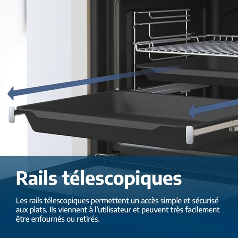 - Rails téléscopiques : ils permettent d'accéder à vos plats en les faisant coulisser en dehors de l'enceinte de cuisson en évitant les risques de basculement. Vous pourrez arroser confortablement votre rôti ou retourner facilement vos plats sans risque de brûlure.