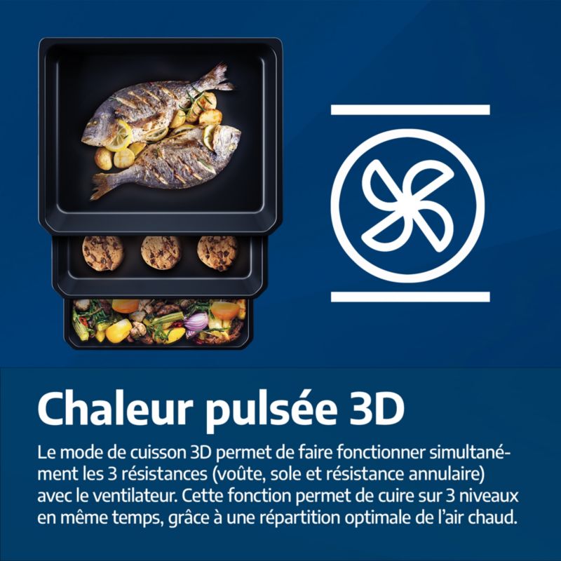 - Avantage de la chaleur tournante pulsée : le four est équipé d'un ventilateur et d'une résistance circulaire situées sur la paroi arrière du four, pour une cuisson simultanée de différents plats sur plusieurs niveaux