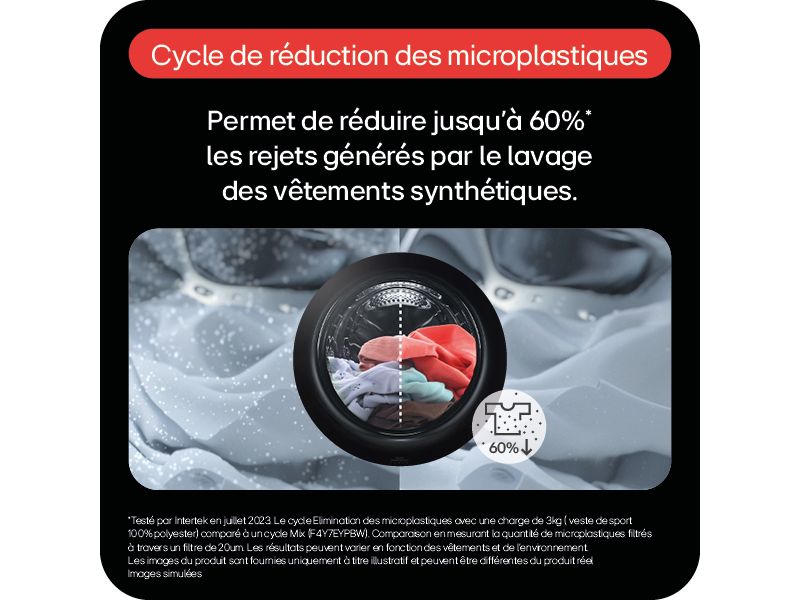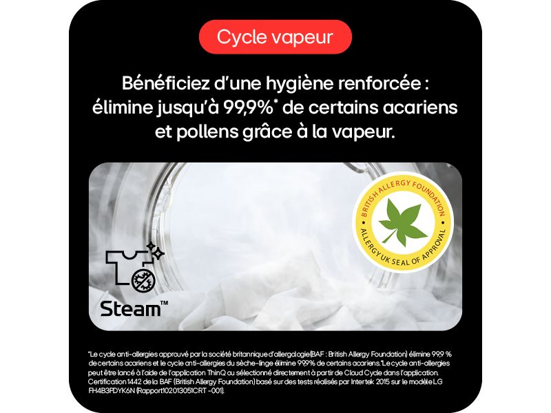 - Lavage vapeur en profondeur : oui, idéal pour une hygiène parfaite et les personnes allergiques, élimine jusqu'à 99,9% des bactéries de votre linge grâce à la combinaison de la vapeur et du lavage à haute température.