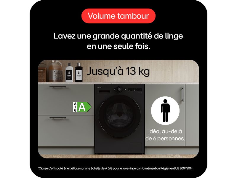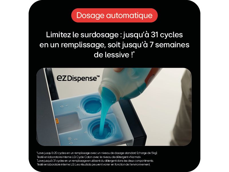 - Distributeur automatique de lessive : oui, remplissez le réservoir 1 fois pour 20 à 35 cycles. La machine adapte la consommation de produits lessiviels en fonction de la quantité de linge et de l'état de saleté.