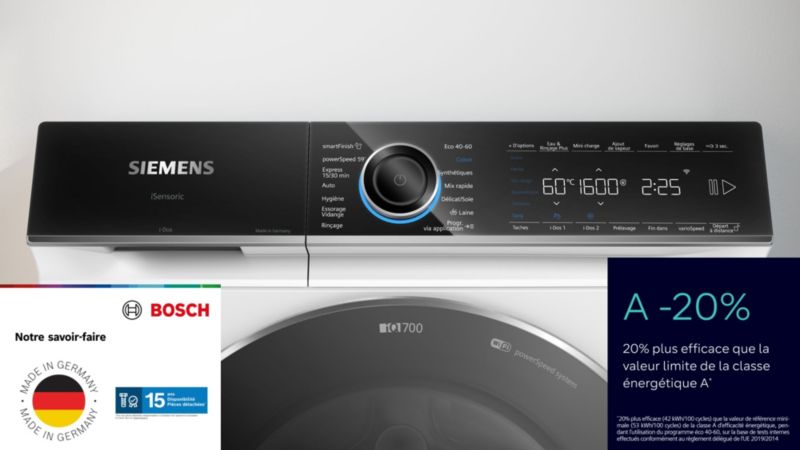 - Compatible avec sèche linge de la même gamme : le sèche-linge s'ajustera automatiquement au programme de lavage effectué par la lave-linge