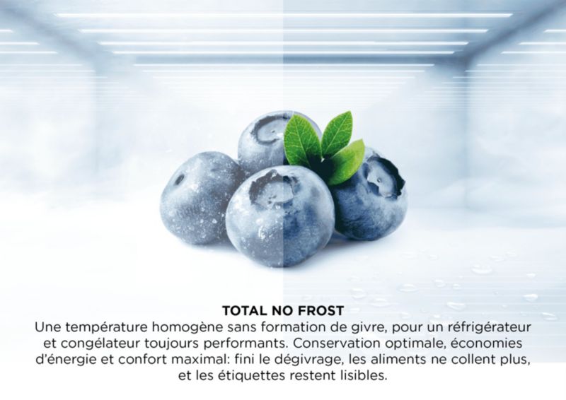 - Froid du réfrigérateur : le froid ventilé permet une répartition du froid de manière homogène et un rangement libre, sans contrainte, des aliments dans le réfrigérateur