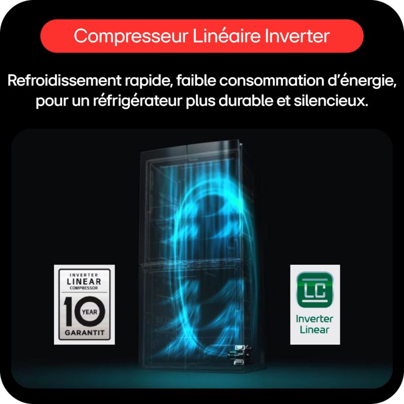 - Type de moteur : inverter, un compresseur à induction plus silencieux et qui permet aussi de limiter la consommation d'énergie