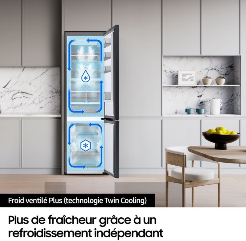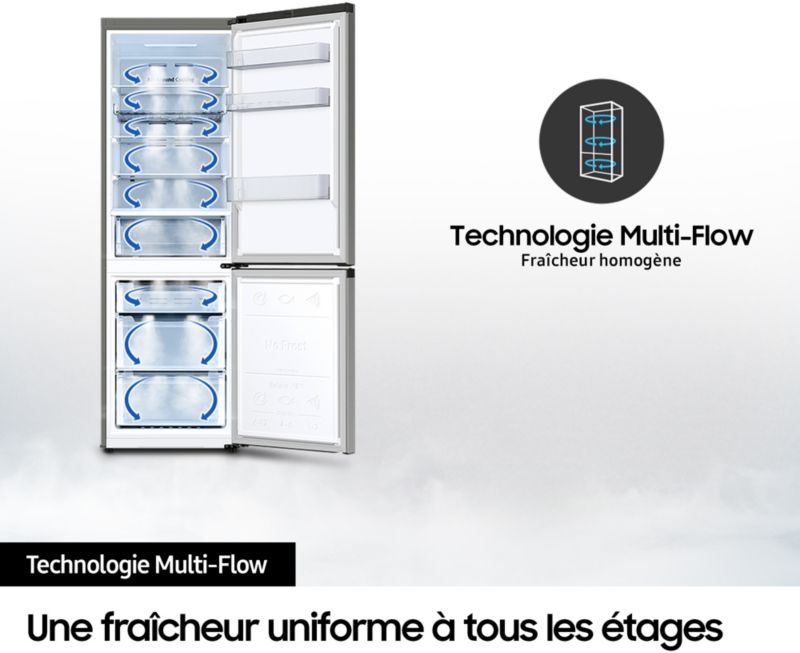 - Froid du réfrigérateur : le froid ventilé permet une répartition du froid de manière homogène et un rangement libre, sans contrainte, des aliments dans le réfrigérateur
