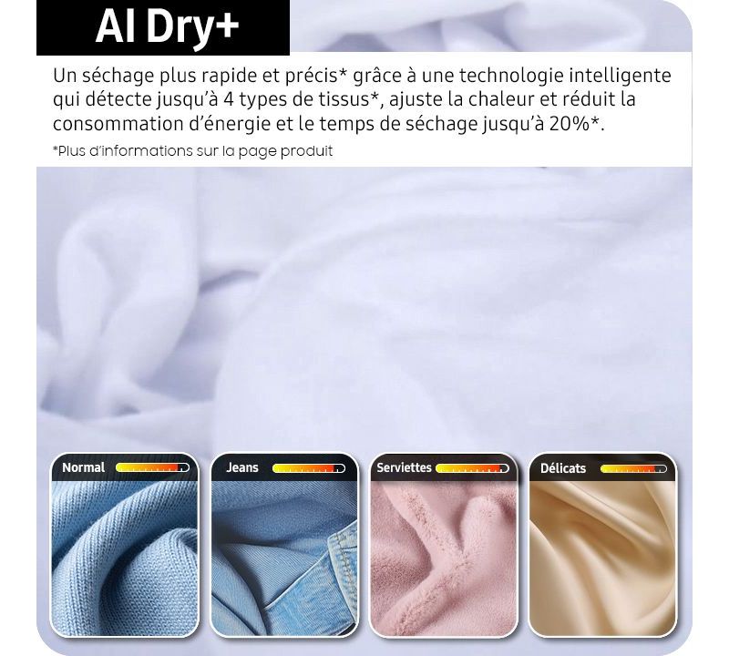 - AI Dry : un capteur d'humidité mesure en permanence l'humidité des vêtements et détecte avec précision leur degré de séchage. Par conséquence, le temps de séchage est réduit.
