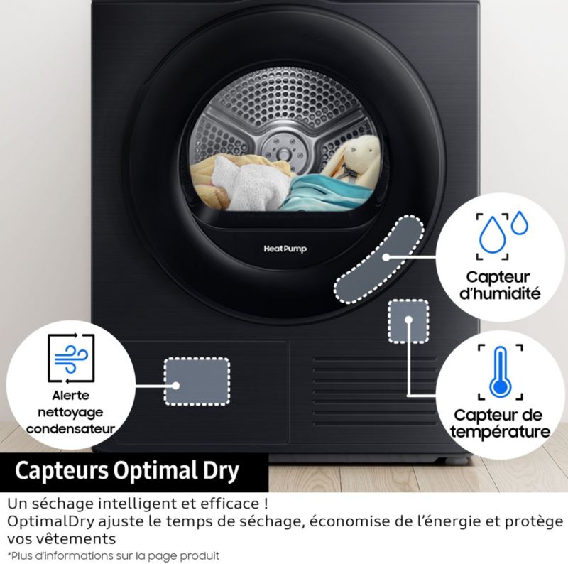 - Optimal Dry : l'arrêt du séchage est automatique grâce au capteur d'humidité, ce qui permet des économies d'énergies et un plus grand soin du linge.