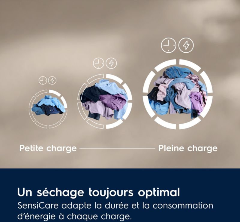 - SensiCare : ajuste la durée du séchage au taux d'humidité de votre de linge, afin d'éviter le surséchage et ainsi de préserver plus longtemps l'aspect du neuf.