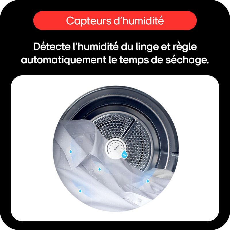 - Sonde d'humidité : oui, elle permet l'arrêt automatique du sèche linge quand le linge est sec.