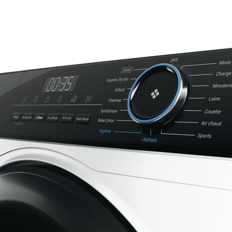 - Programmes : charge mixte, chemises, coton, coton éco, couette, délicat, éco, laine, sport, synthétique, prêt à repasser, prêt à ranger, prêt à porter