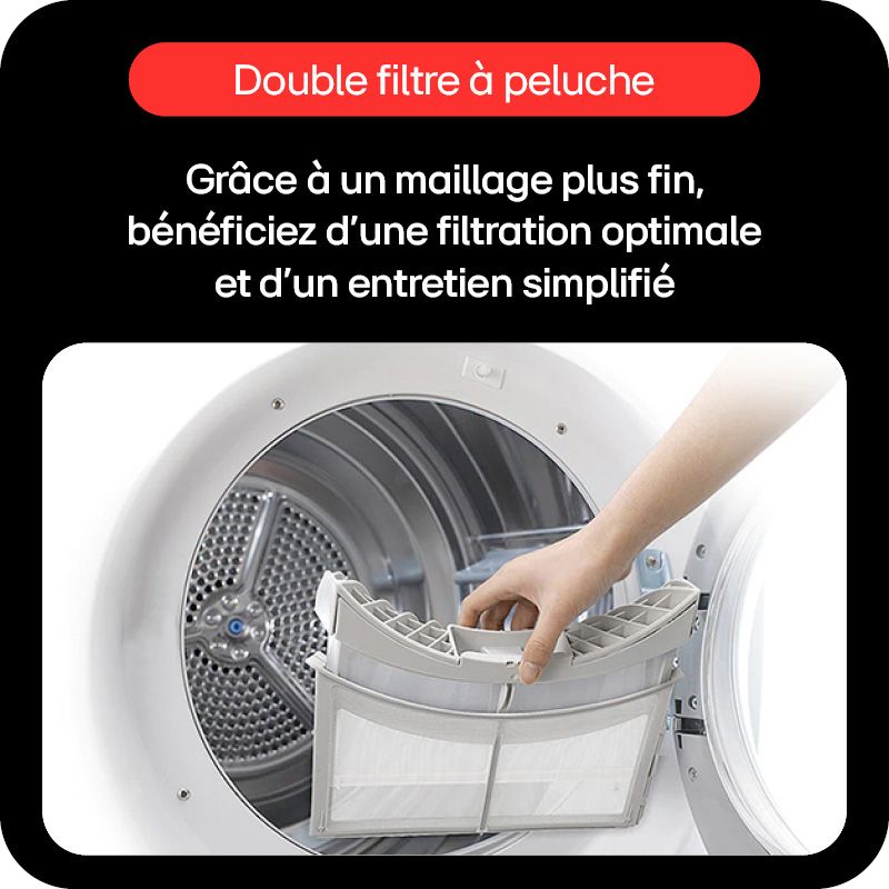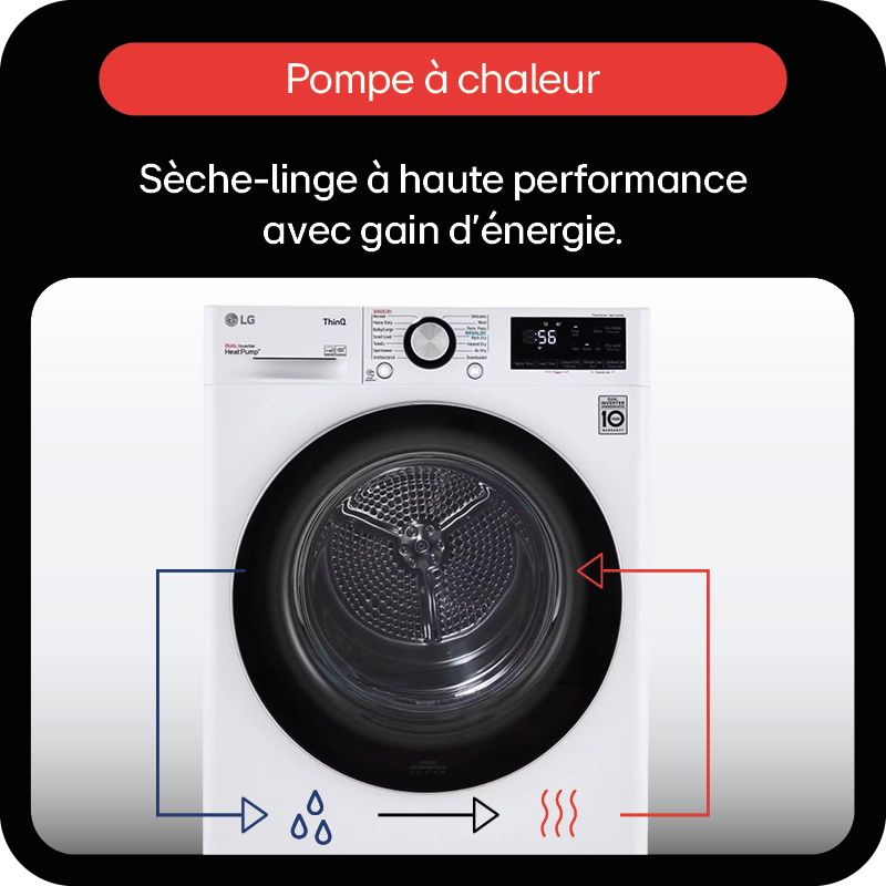 - DUAL Inverter HeatPump : le sèche-linge pompe à chaleur à double cylindre (DUAL Inverter Heat Pump) vous facilite la vie en s'adaptant à votre style de vie ainsi qu'à vos envies grâce aux options économie d'énergie et séchage rapide.