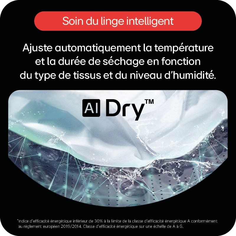 - AI Dry : un capteur d'humidité mesure en permanence l'humidité des vêtements et détecte avec précision leur degré de séchage. Par conséquence, le temps de séchage est réduit.