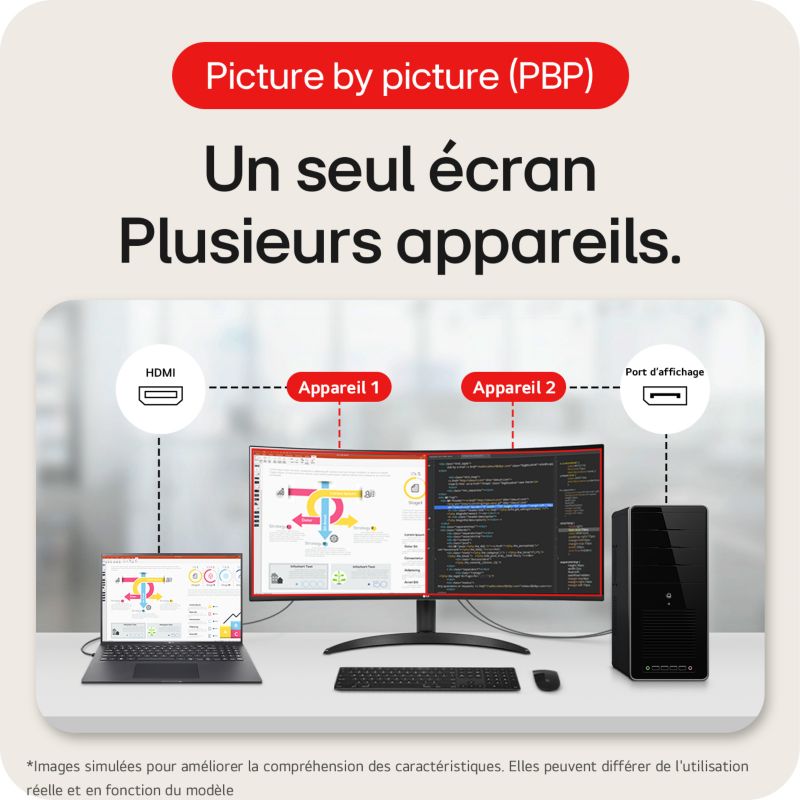 - Format : 21/9, offre 1/3 d'espace supplémentaire à l'écran, et permet d'afficher plusieurs fenêtres