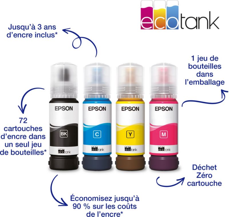 - Type de consommables : réservoirs d'encre, se rechargent avec des bouteilles d'encre liquides de grande capacité. Pemet d'avoir une autonomie d'impression plus grande et un niveau d'encre visible
