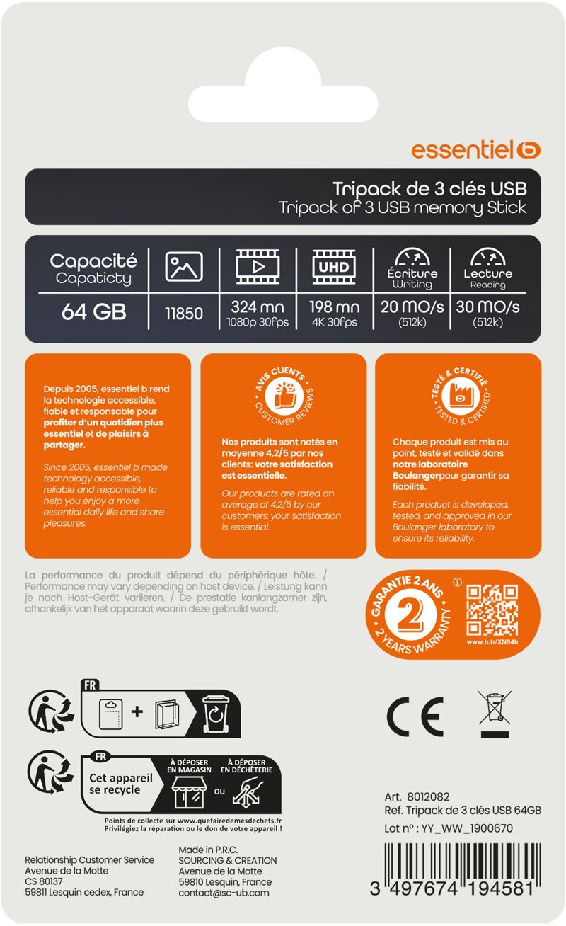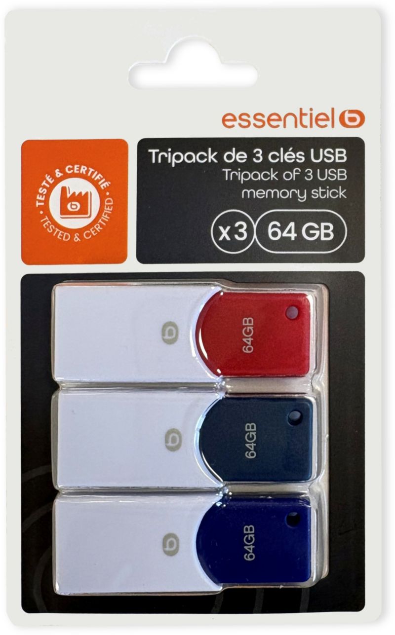 • Référence constructeur : Essentiel B CLE USB Tripack x 3 64Go