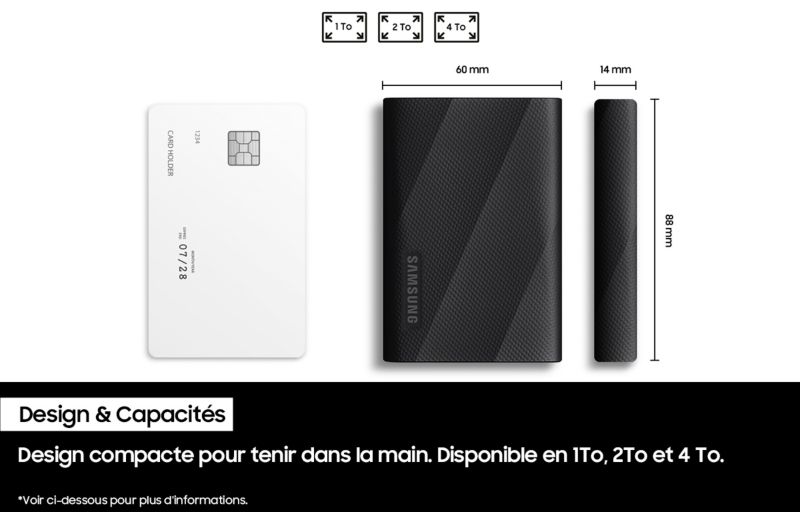 - Technologie : le SSD (Solid-State Drive) est à la fois léger et compact (il se glisse dans une poche de pantalon). Il résiste aux chutes, il est donc idéal pour les déplacements. Les vitesses de chargement et de copie sont rapides.