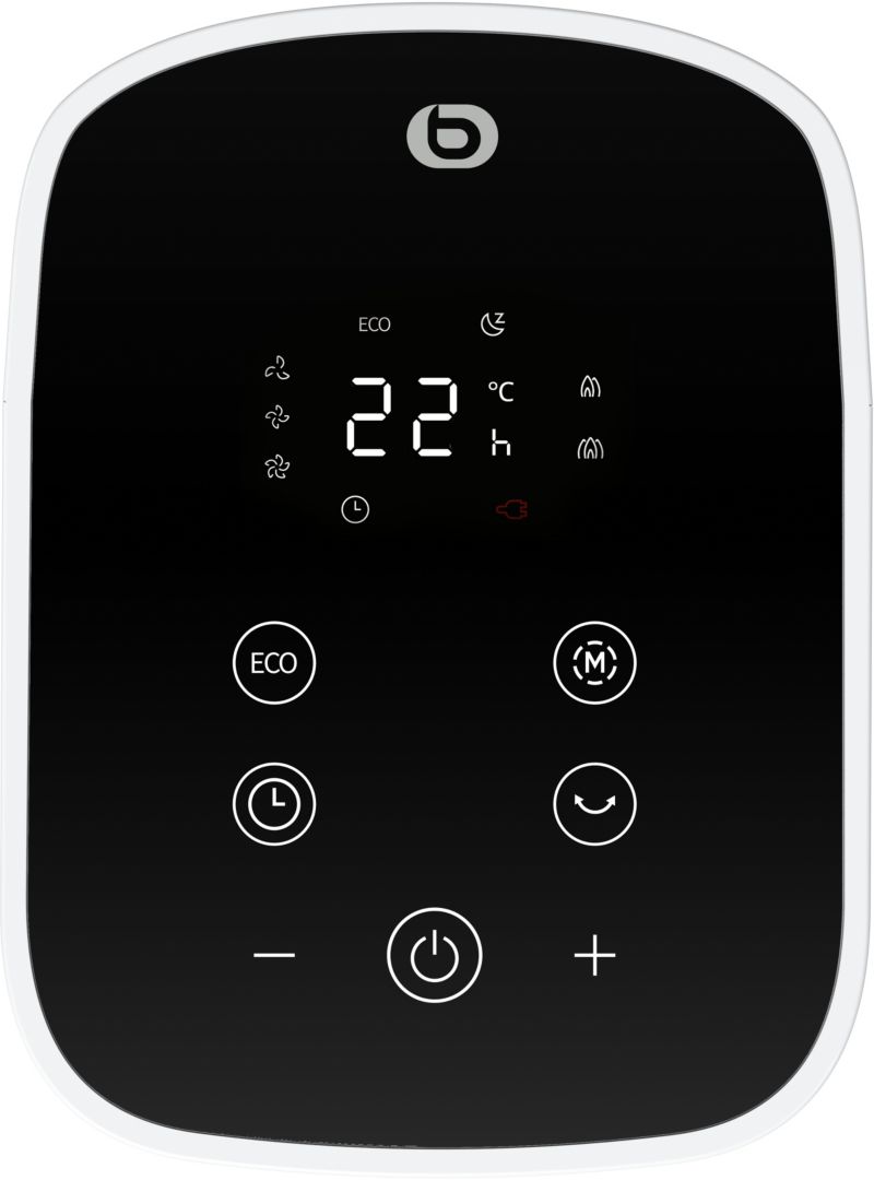 Le + : Ventilateur et chauffage 2-en-1 avec oscillation horizontale (±60°), programmateur 24h et mode nuit.