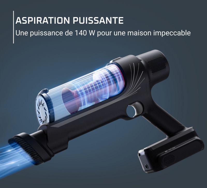 - Détail sur la puissance d'aspiration : Elle peut varier en fonction du type de sols (parquet, carrelage, tapis, moquette) que vous aspirez et du mode utilisé (standard, éco, boost)
