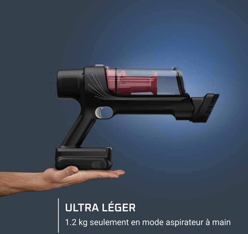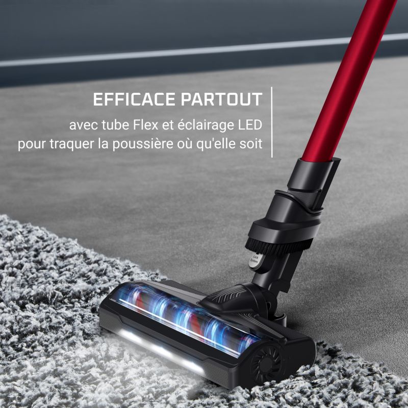 - Brosse motorisée avec éclairage LED : Elle s'adapte à tous les types de sols. Son éclairage LED permet de mieux voir la poussière et plus loin pour un nettoyage plus efficace