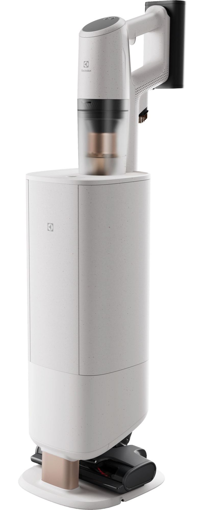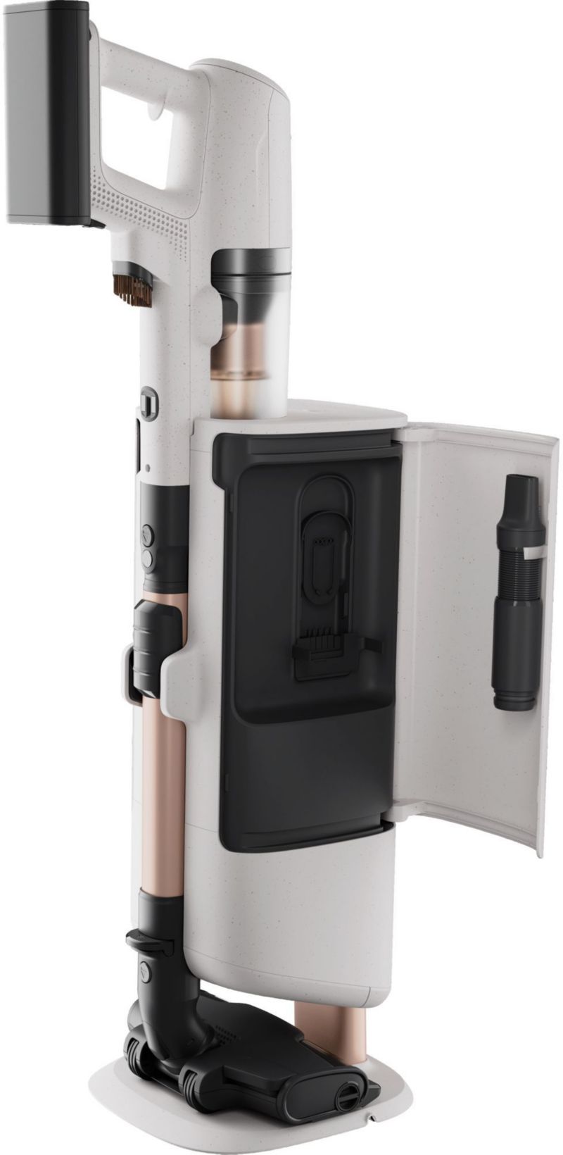 - Station de charge et de vidage : Pour recharger et vider automatiquement le réservoir de l'aspirateur dans le bac/sac de la station. Permet également de le ranger ainsi que ses accessoires