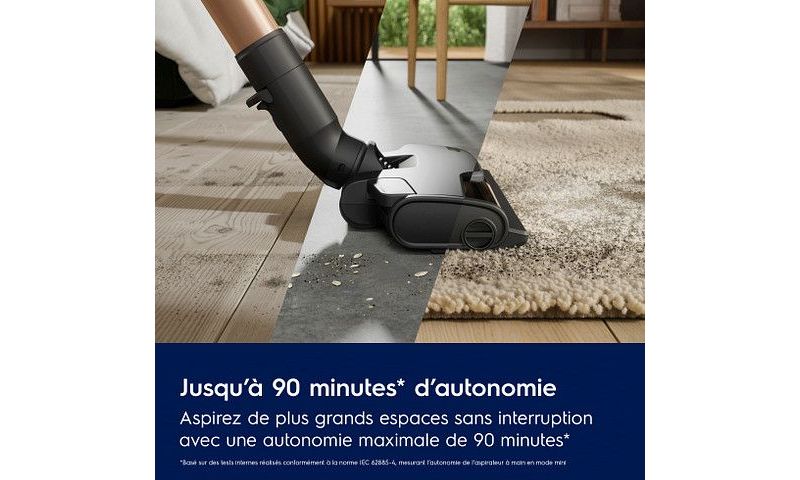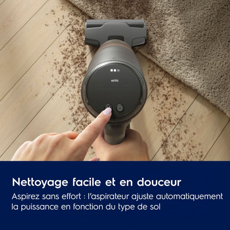 - Détail sur la puissance d'aspiration : Elle peut varier en fonction du type de sols (parquet, carrelage, tapis, moquette) que vous aspirez et du mode utilisé (standard, éco, boost)