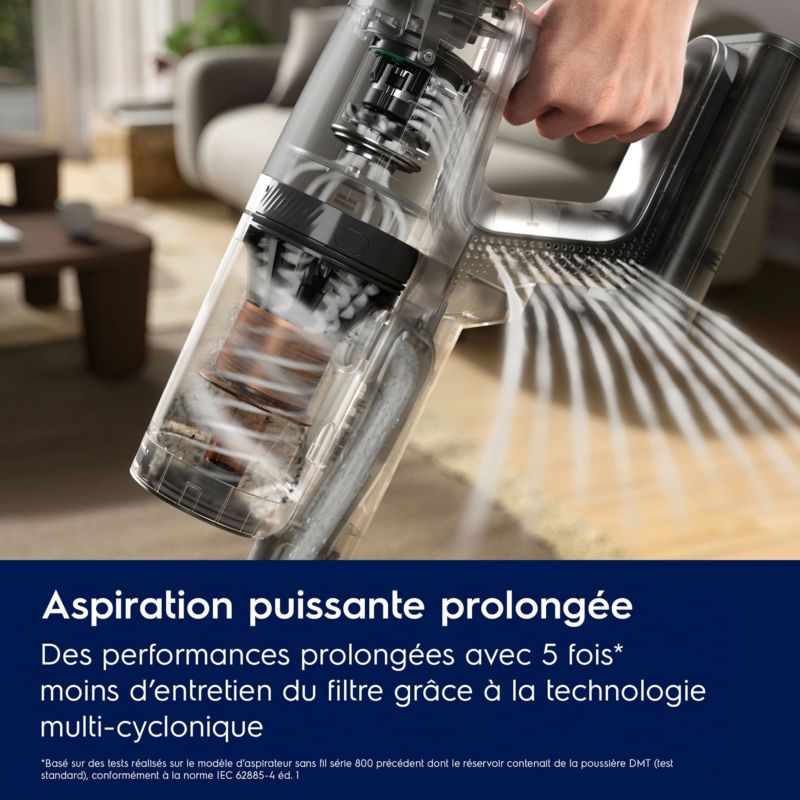 - Aspirateur à main : Directement intégré au corps de l'aspirateur balai. Se détache facilement pour une utilisation d'appoint (ex: table, voiture, fauteuil)